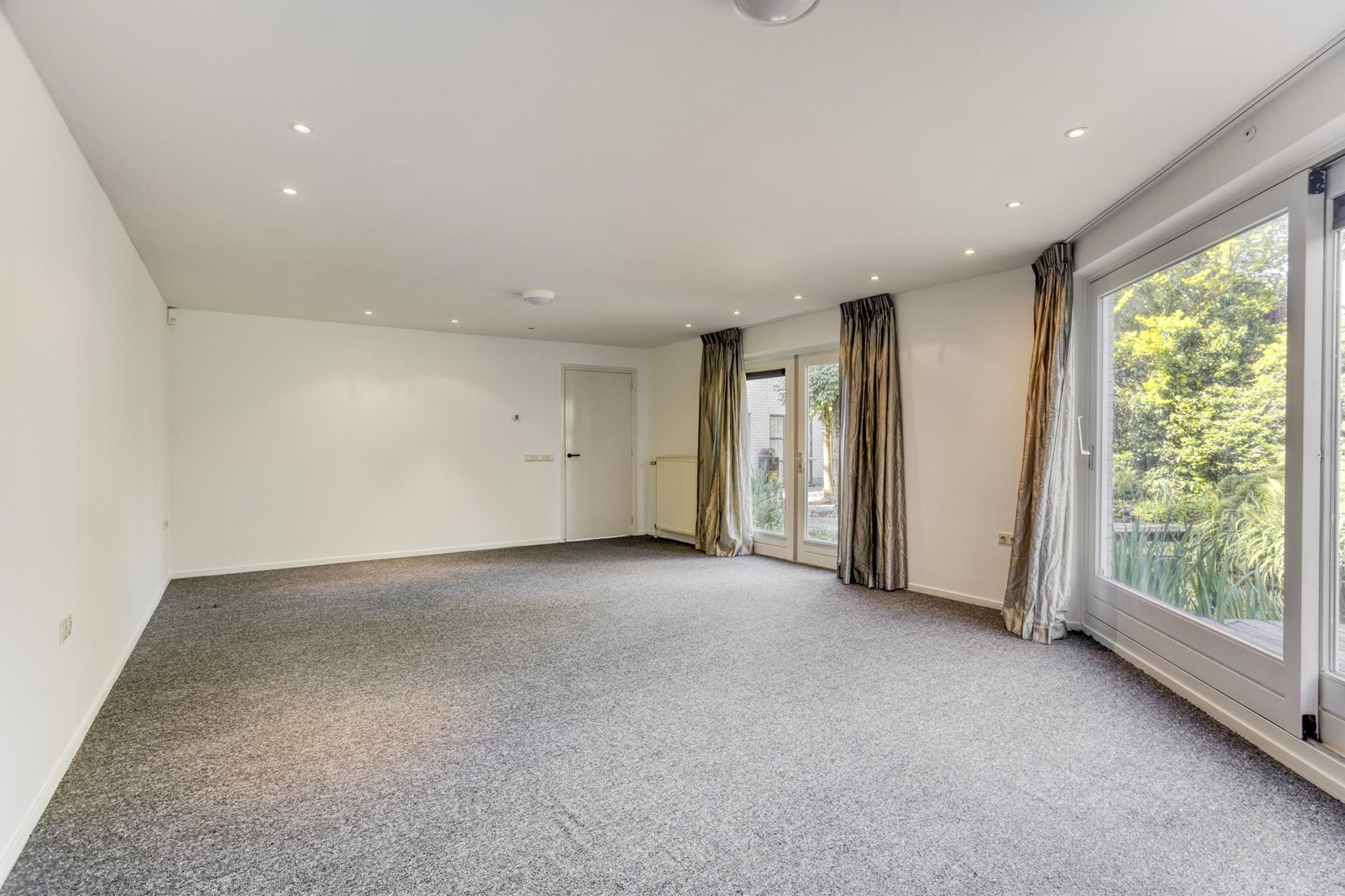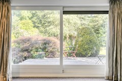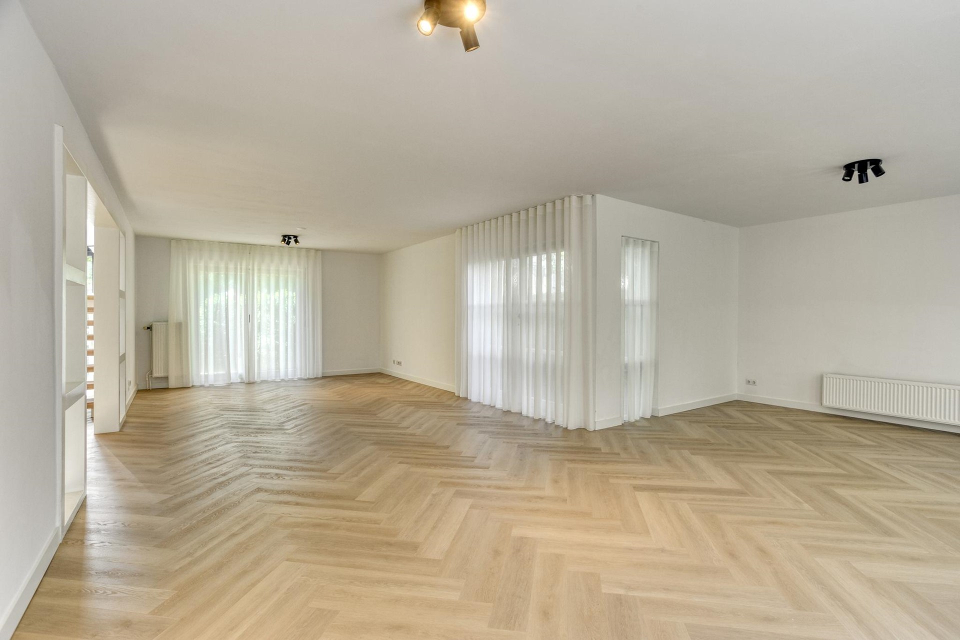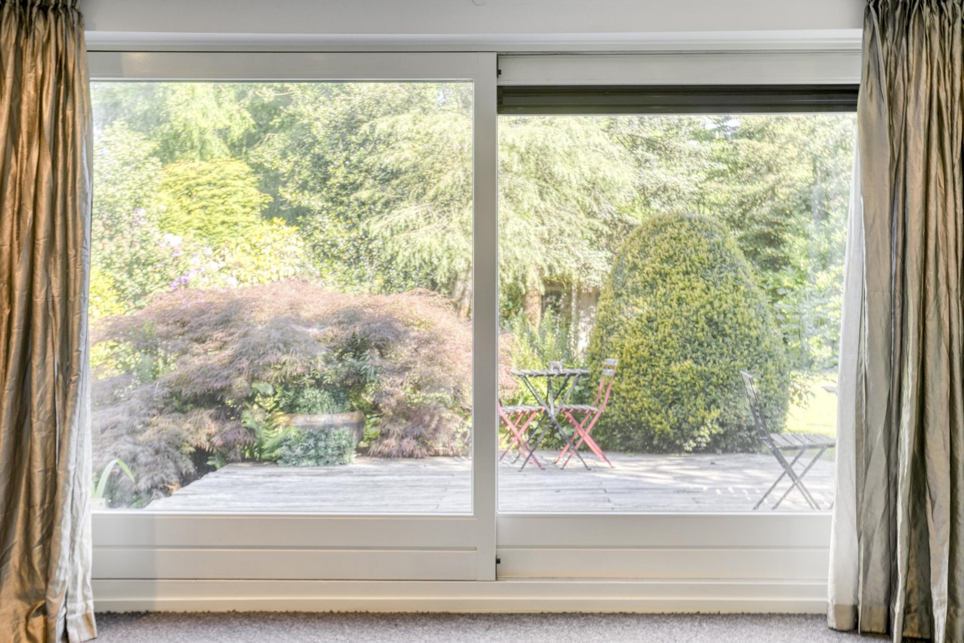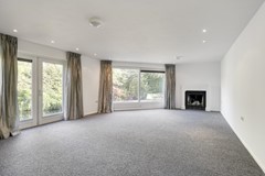 De indrukwekkende **woonkamer** biedt meerdere zithoeken en een panoramisch uitzicht op de fraai aangelegde, groene tuin op het zuidwesten.