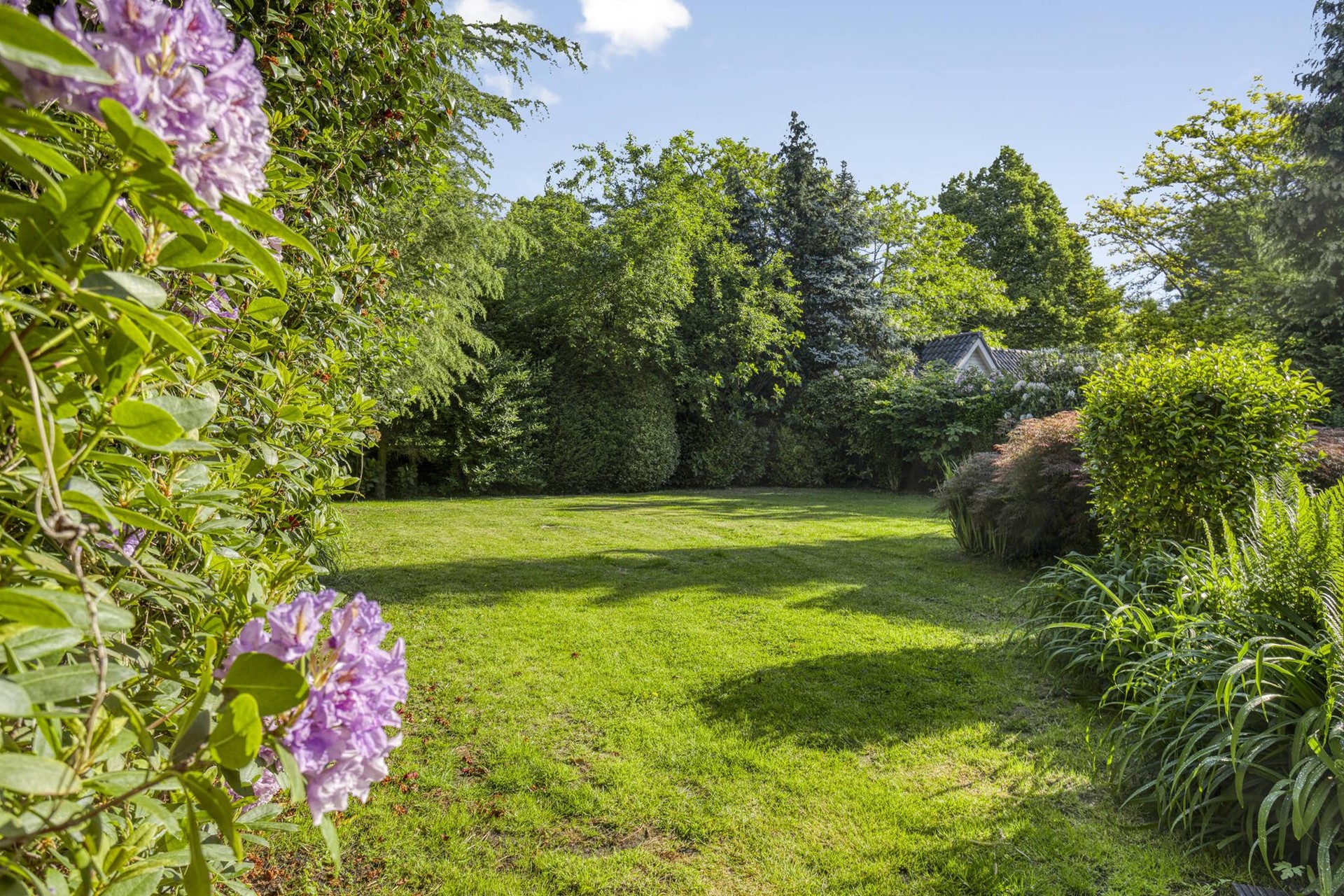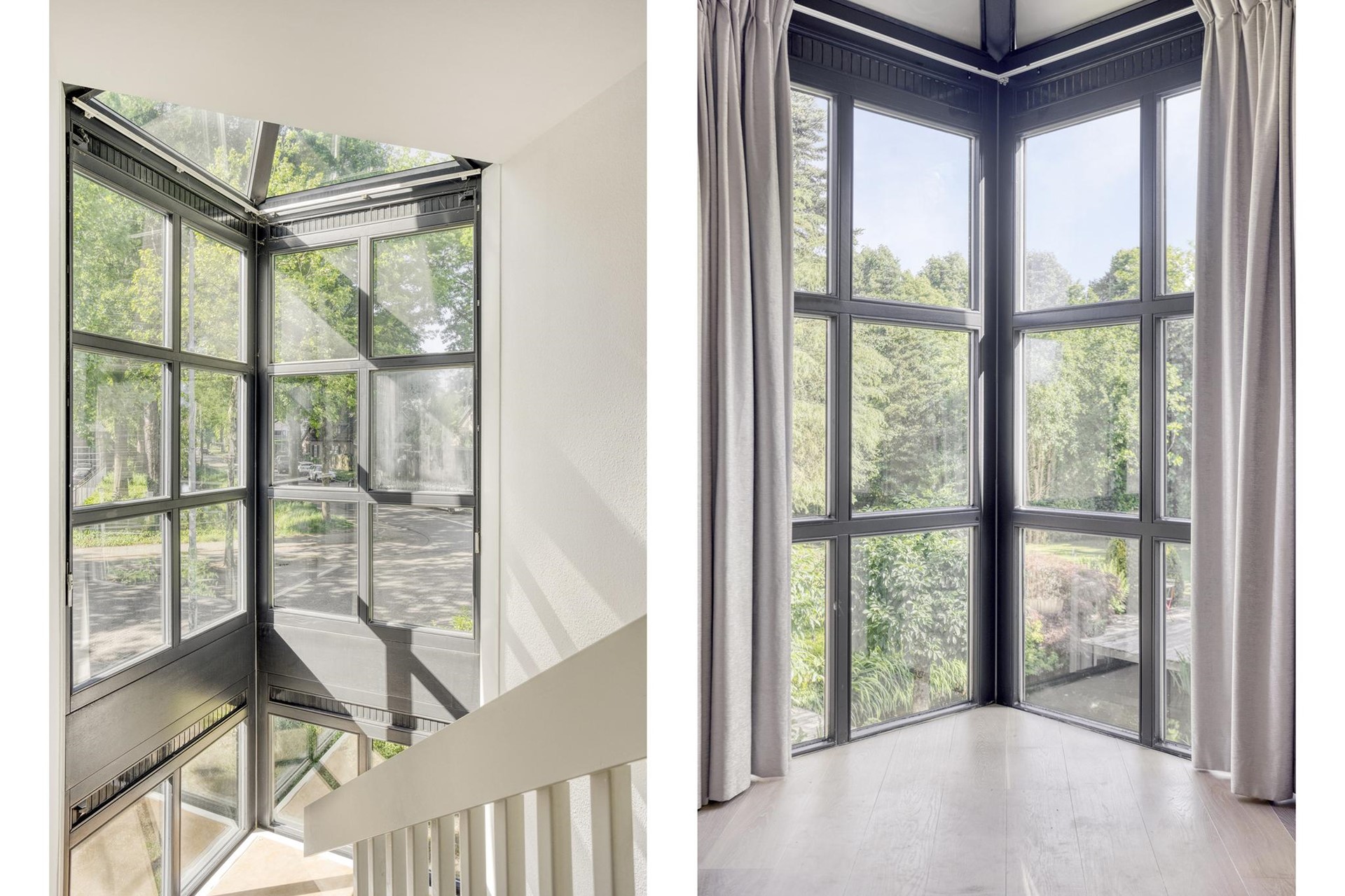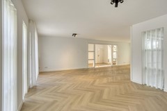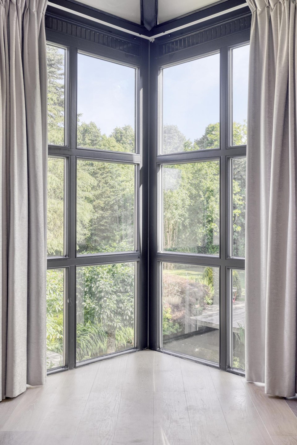 De indrukwekkende **woonkamer** biedt meerdere zithoeken en een panoramisch uitzicht op de fraai aangelegde, groene tuin op het zuidwesten.