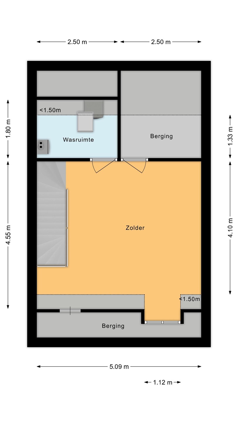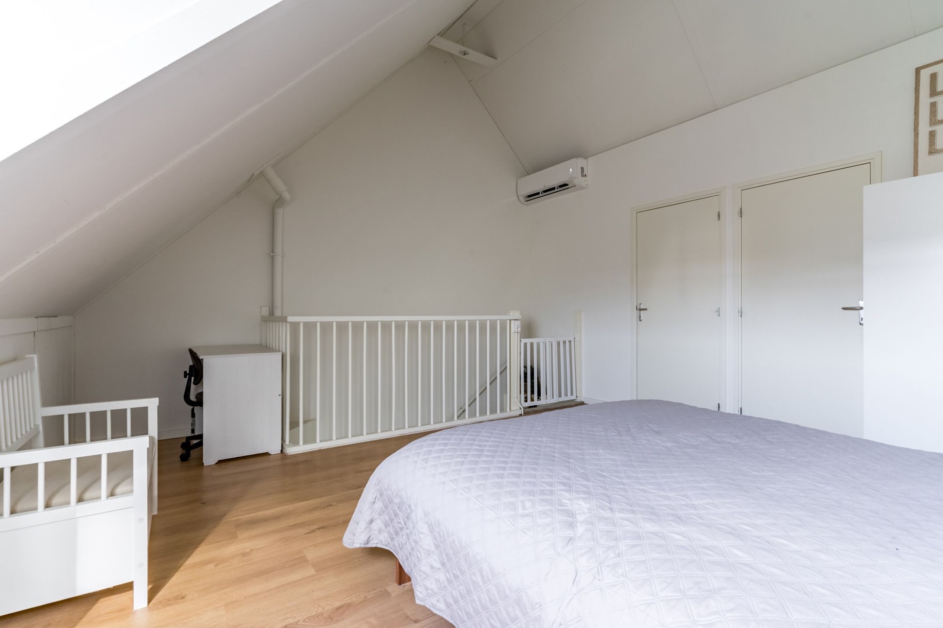 Wanneer je via de vaste trap de bovenste verdieping bereikt, kom je terecht in een grote zolderkamer, waar je mede dankzij een dakkapel van extra veel ruimte profiteert. Op zolder is een vaste airco-unit geïnstalleerd, waardoor je het hier ook ’s zomers lekker koel kunt houden. Verder is zolderkamer voorzien van een keurige laminaatvloer met vloerverwarming, die doorloopt tot in de aangrenzende berging en een volwaardige wasruimte. Laatstgenoemde heeft een Velux-dakraam en herbergt verder een mechanisch ventilatiesysteem (Duco), de cv-ketel, de omvormer voor de zonnepanelen en aansluitpunten voor wasapparatuur.